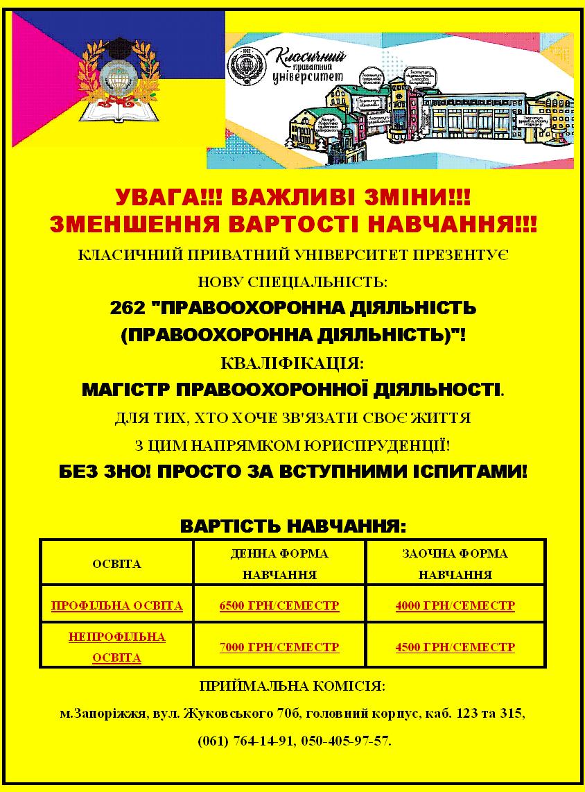 УВАГА !!! ВАЖЛИВІ ЗМІНИ !!! ЗМЕНШЕННЯ ВАРТОСТІ НАВЧАННЯ НА НОВУ СПЕЦІАЛЬНІСТЬ "262 ПРАВООХОРОННА ДІЯЛЬНІСТЬ (ПРАВООХОРОННА ДІЯЛЬНІСТЬ)" !!! КЛАСИЧНИЙ ПРИВАТНИЙ УНІВЕРСИТЕТ РАДО ЗАПРОШУЄ ВАС НА НАВЧАННЯ!!! АЛЕ ПАМ'ЯТАЙТЕ: КІЛЬКІСТЬ МІСЦЬ - ДОСТАТНЯ, АЛЕ НЕ БЕЗМЕЖНА !!! БІЛЬШ ДЕТАЛЬНО МОЖНА ДІЗНАТИСЯ НА НАШОМУ САЙТІ: http://virtuni.education.zp.ua/info_cpu/node/4937