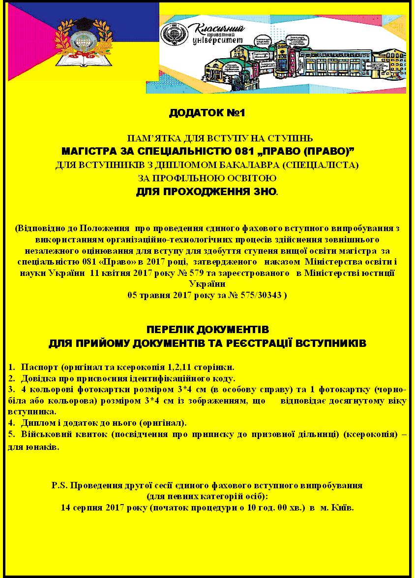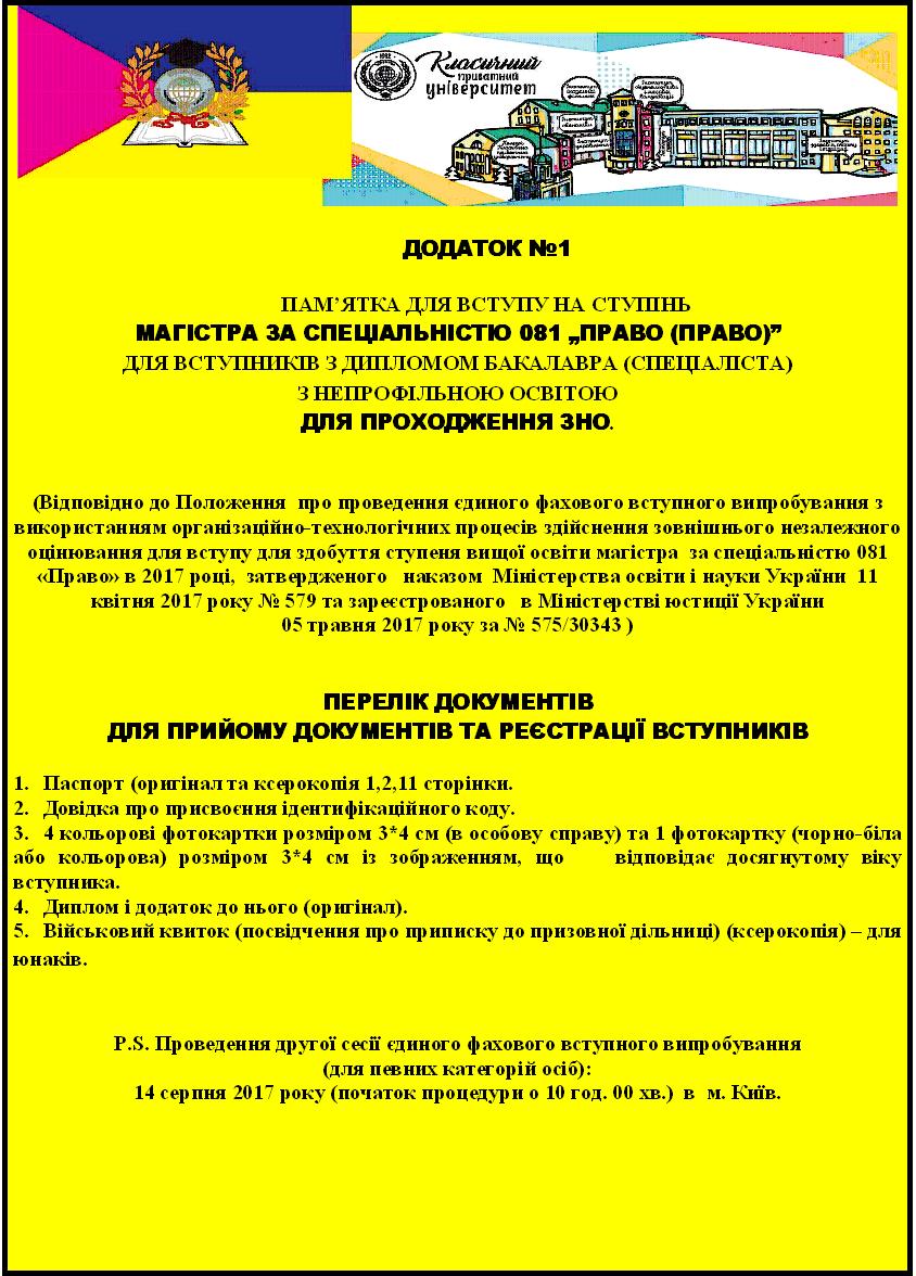 УВАГА!!! ЦЕ ВАЖЛИВО!!! 12 ЛИПНЯ 2017 РОКУ ПОЧИНАЄТЬСЯ РЕЄСТРАЦІЯ НА ЗНО ДЛЯ АБІТУРІЄНТІВ, ЩО ВСТУПАЮТЬ ДО МАГІСТРАТУРИ ПО СПЕЦІАЛЬНОСТІ "081 ПРАВО (ПРАВО)" !!! НАГАДУВАННЯ ДЛЯ АБІТУРІЄНТІВ, ЯКІ МАЮТЬ НЕПРОФІЛЬНУ ОСВІТУ (ВСІ ІНШІ СПЕЦІАЛЬНОСТІ ОКРІМ „ПРАВО” АБО „ПРАВОЗНАВСТВО”) !!!
