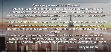 Никогда не считай себя умнее покупателя, хотя бы потому, что у него уже хватило ума заработать те деньги, которые теперь хочешь заработать ты.